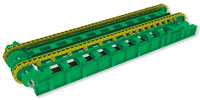 MMD重型板式給料機的主體結構是重型鏈條和托輪直接安裝在給料機主框架上。鏈條和鏈輪的型號根據(jù)所受載荷和不同工礦而確定。鏈條和托輪采用卡特彼勒公司生產(chǎn)制造的D4,D7,D9,D11牽引鏈。因此,MMD重型板式給料機也分為D4,D7,D9,D11四種型號。