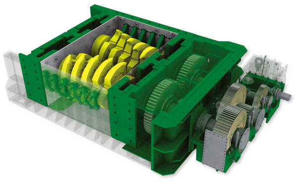典型的MMD1000系列3齒5環(huán)篩分破碎機(jī)配置單驅(qū)400KW電機(jī),設(shè)備總重約60噸。