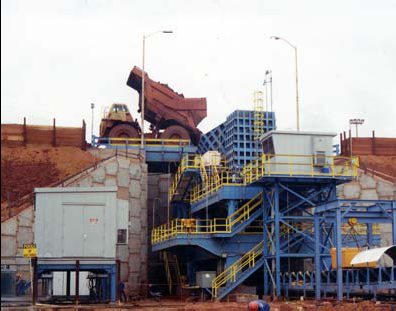 固定式破碎站的優(yōu)點是價格便宜,缺點是采掘設(shè)備和破碎站間的運輸距離和提升高度隨著采掘面的推進(jìn)而逐步增加。